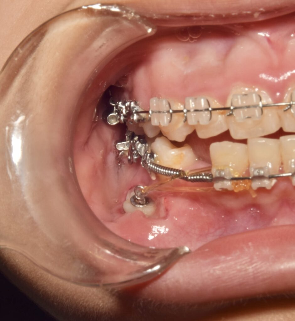 今装置を使って歯ぐきの中にある犬歯を少しずつ引っ張り、本来の位置へ導いていきました。