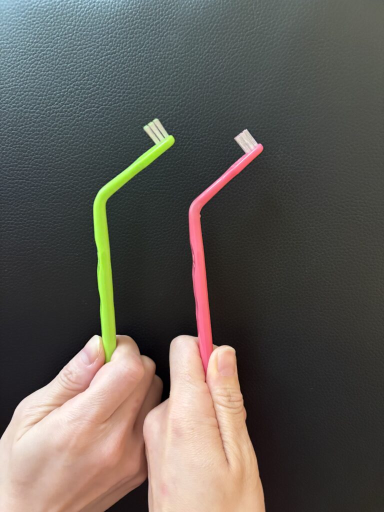 グリーンとピンクの歯ブラシ、どちらも副院長の手作り👏🏻