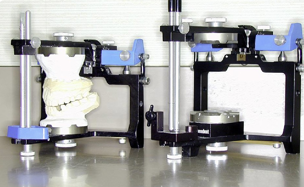 上下の歯の位置関係や咬み合わせのズレを正確に再現するため、咬合器という専門の装置に模型を装着します。
